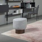 The padded top section is the same in both Belt and Cross, with no straight lines but only curved surfaces that gently complement each other, gracefully floating on their base. They are distinguished by their bases, which give each of them a distinct personality: the Belt pouf’s round metal base plays with the concept of stability, while Cross’ cross-shaped wooden base is the detail that makes this accessory immediately recognisable. While their similarities make them ideal for pairing together, like two members of the same family with opposing personalities that complement each other, it is their differences and the variety of possible combinations that create a dynamic, lively and constantly changing environment.