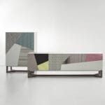 The Doppler sideboards are inspired by the illusion of overlapping surfaces, whereas actually the doors are made up of a single surface: indeed, it is the combination of various brightly coloured graphic patterns that creates this particular optical effect. The asymmetrical opening of the doors is an additional sign of originality. The lacquered wood frame is supported by a solid wood base. Doppler sideboards are available in two different sizes: one high and the other low, to furnish both the living room and the bedroom. The Doppler K sideboards supplement the Doppler sideboard collection. They are available in the same sizes and propose the same asymmetrical opening of the doors,which in this case are made of ceramic; the frame is in white or black lacquered wood and is supported by a metal base.
