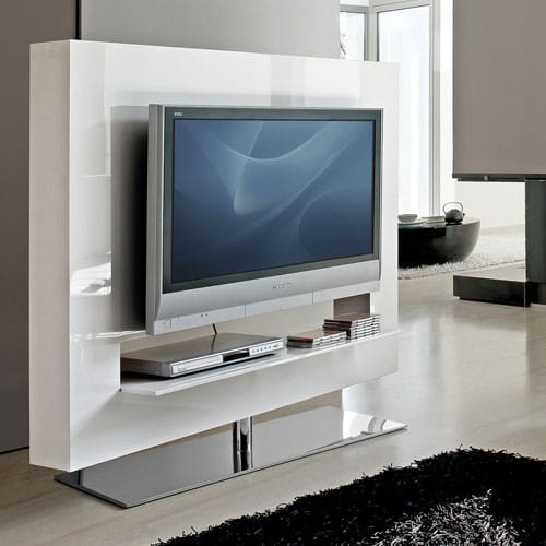The Panorama TV unit has a rectangular shape and stands out fot its lateral DVD storage compartments. The frame is available in lacquered glossy white or black at the front. The 360° revolving base is made of chromed steel.