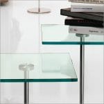 The Gliss Side Table by Philip Jackson is comprised of a polished stainless steel round base with a chromed steel leg positioned at the edge of the base supporting a glass or stainless steel top. Cattelan Italia produces the Gliss in the three round top sizes and three square tops.