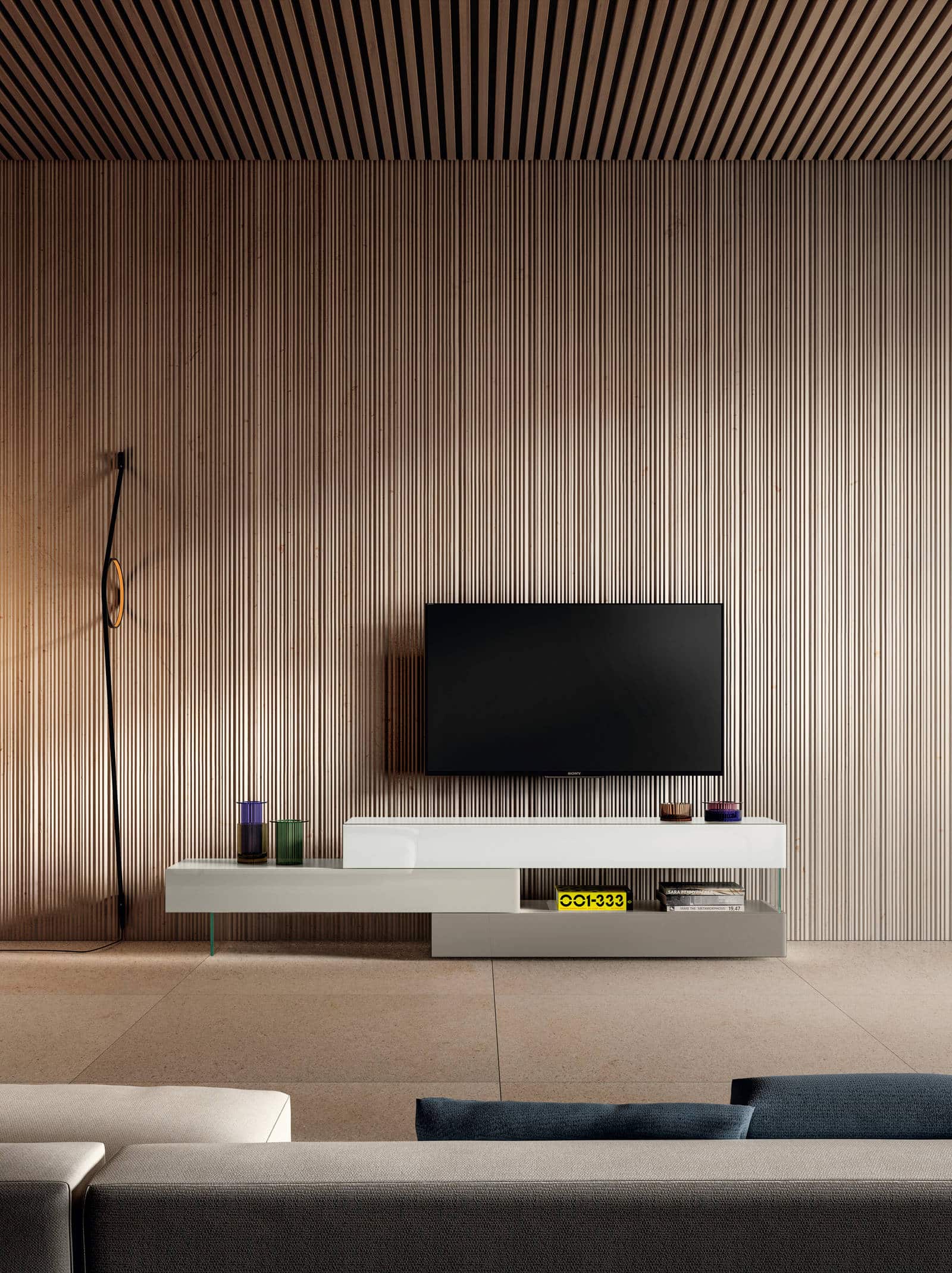 Our Lago 36e8 TV unit combines lightness and elegance with practical storage. Floating on transparent supports, its modular design keeps cables and media hidden while showcasing clean, handle-free lines. Available in lacquer, glass, wood, or marble finishes, it transforms your TV wall into a sleek, modern focal point.