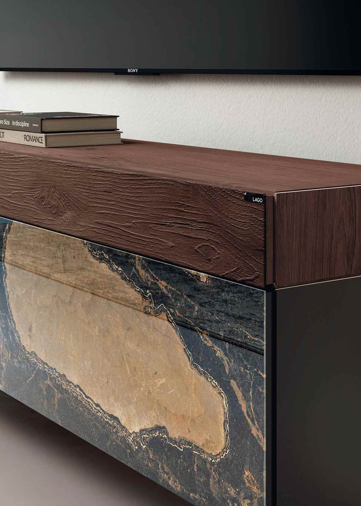 Our Lago 36e8 TV unit combines lightness and elegance with practical storage. Floating on transparent supports, its modular design keeps cables and media hidden while showcasing clean, handle-free lines. Available in lacquer, glass, wood, or marble finishes, it transforms your TV wall into a sleek, modern focal point.