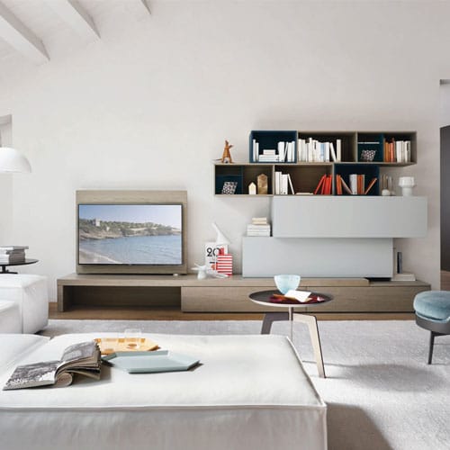 Integrated design in shape and in the finishes. Different solutions for positioning the TV screen which are integrated seamlessly in the design. Modular design with various compositions available