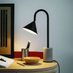 It seems Ozz has gone shy: here it is in the desk version with adjustable shade, making it flexible while taking up minimal space. The counterweight is fundamental even in these small dimensions, maintaining a constant, intense interaction with the lampshade, and creating an original interplay between the shapes. Even more enjoyable in its practicality.