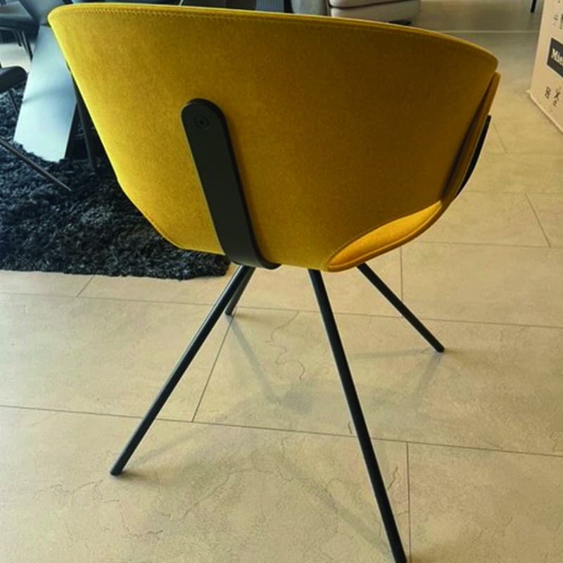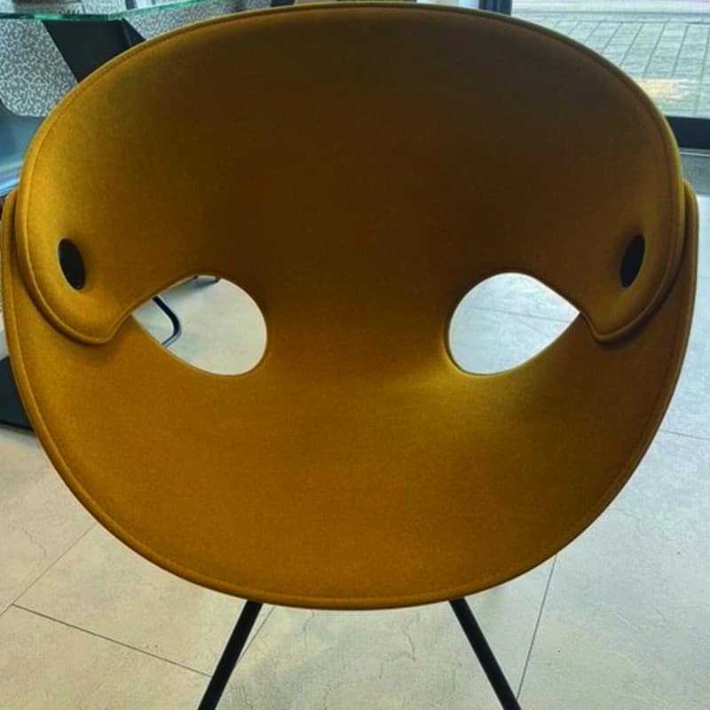 The sculptural, curved shell seat in mustard yellow fabric makes a bold design statement, while the distinctive cut-out details and smooth lines add a contemporary flair. Supported by a sleek black metal base, this chair offers both visual lightness and stability, ideal for modern interiors, reception spaces, or creative offices.