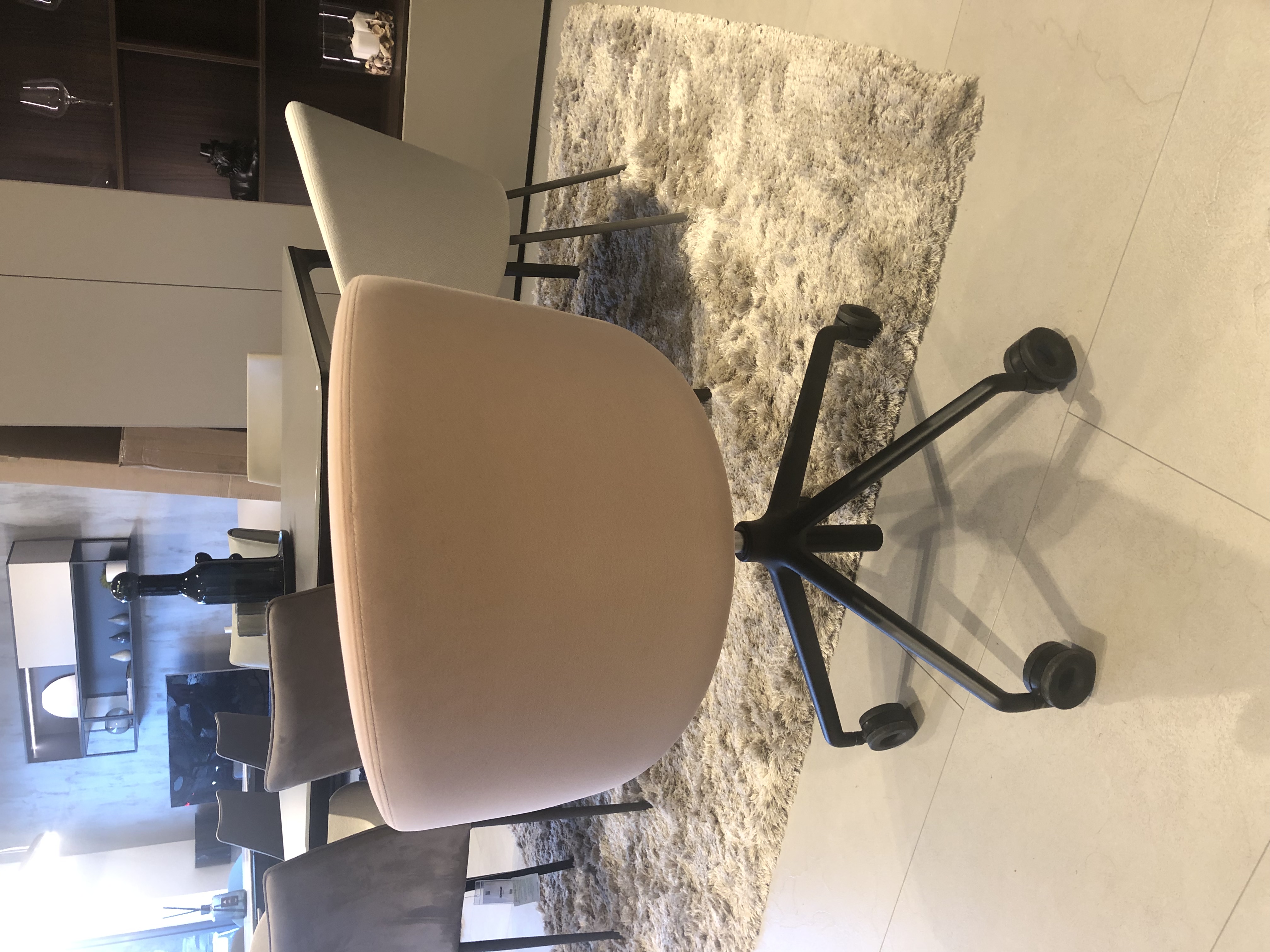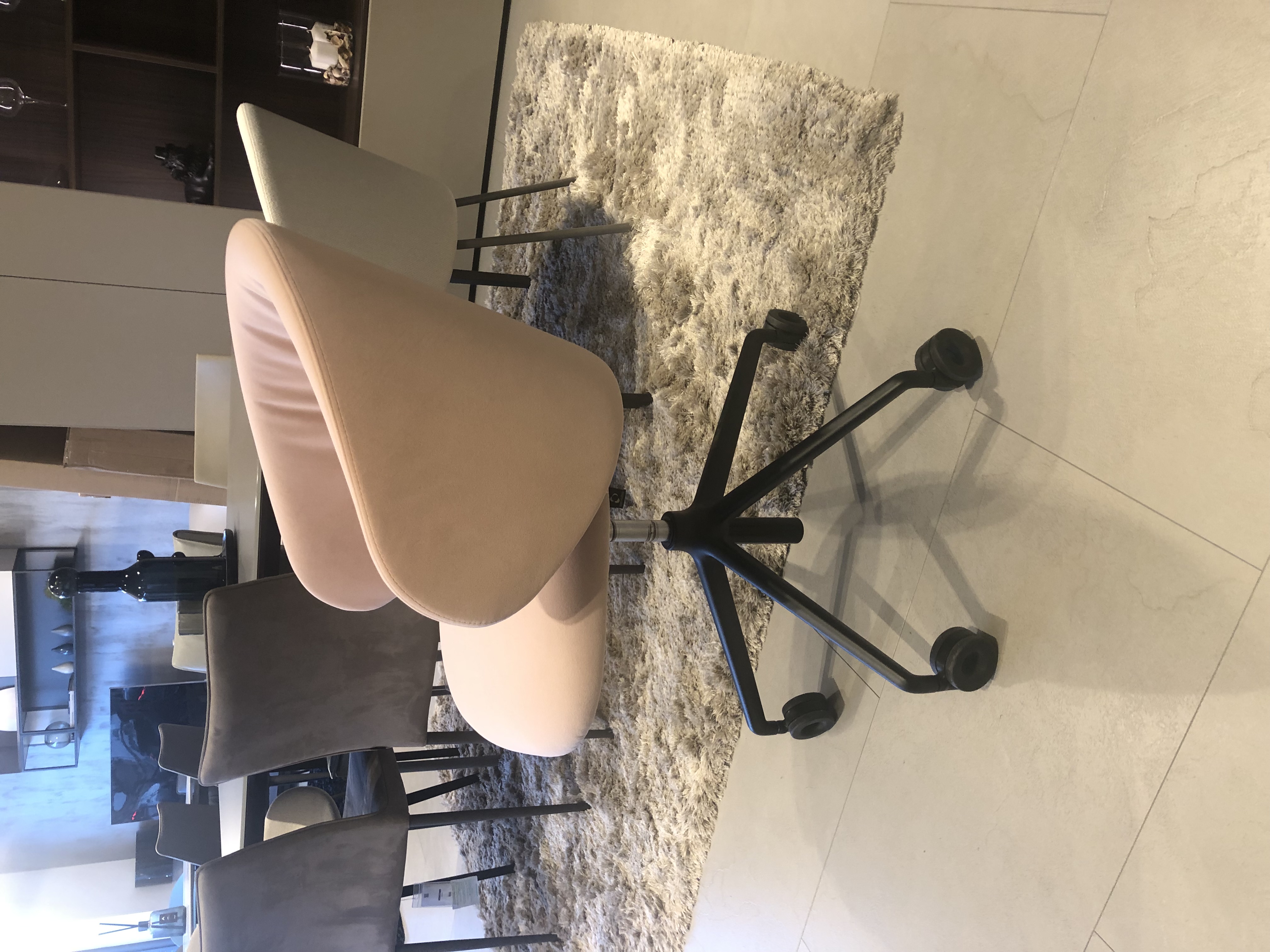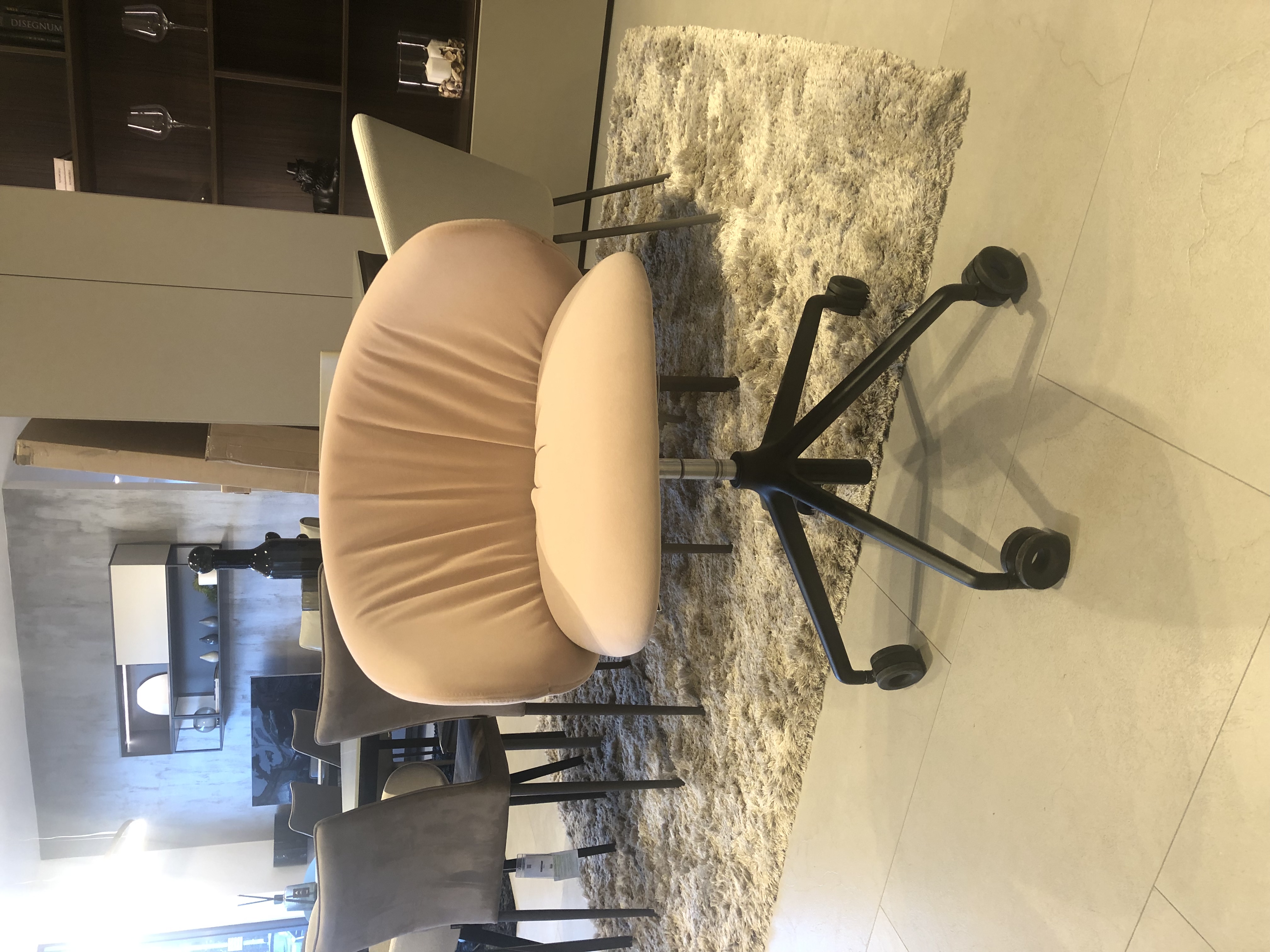 Add a touch of elegance and comfort to your workspace or living area with this stylish ex-display swivel chair. Upholstered in a beautiful soft pink velvet, the chair features a gently curved backrest with subtle pleated detailing that offers both support and a chic, modern look.