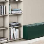Wall 12 bookcase and Box 18 wall units in corda matt lacquered finish, foresta matt lacquered Box 18 base units with matt verde Guatemala marble top. Noa sofa in Rice 12 fabric and cushions in Milton 09 and 21 fabrics with shelf in rovere miele finish. Orbis coffee tables in foresta and ginepro matt lacquered finishes.