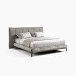 On the Tufté bed, designed by Silvia Prevedello, the generous padded headboard is made even softer by horizontal stitching, forming the distinctive tufted look. The minimalist, functional bed surround sits on wooden feet, giving the impression of a bed floating in the room.